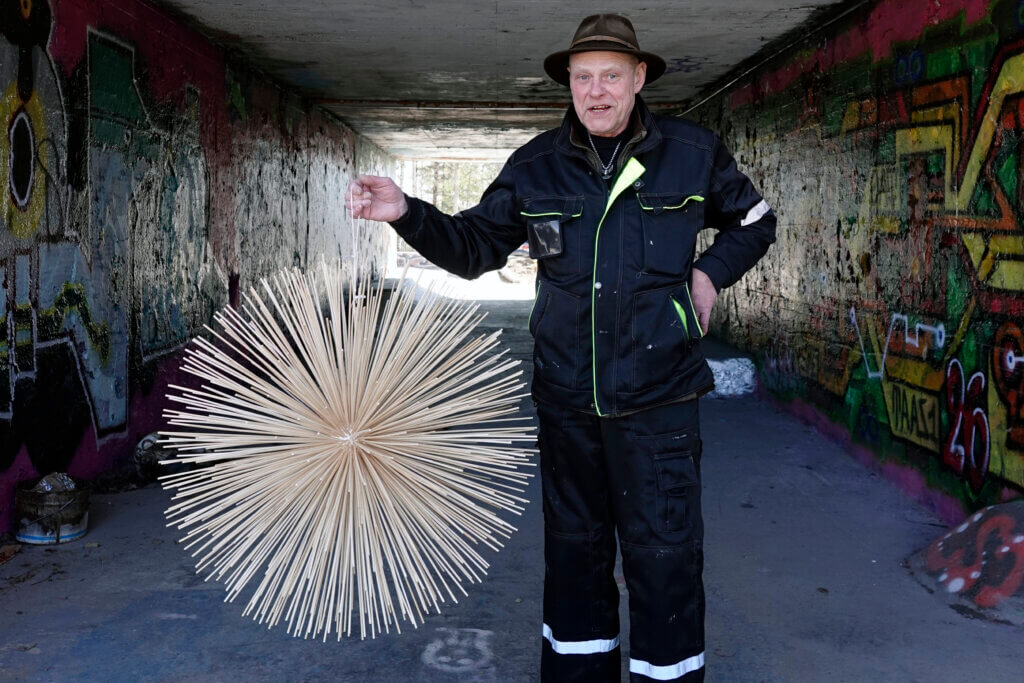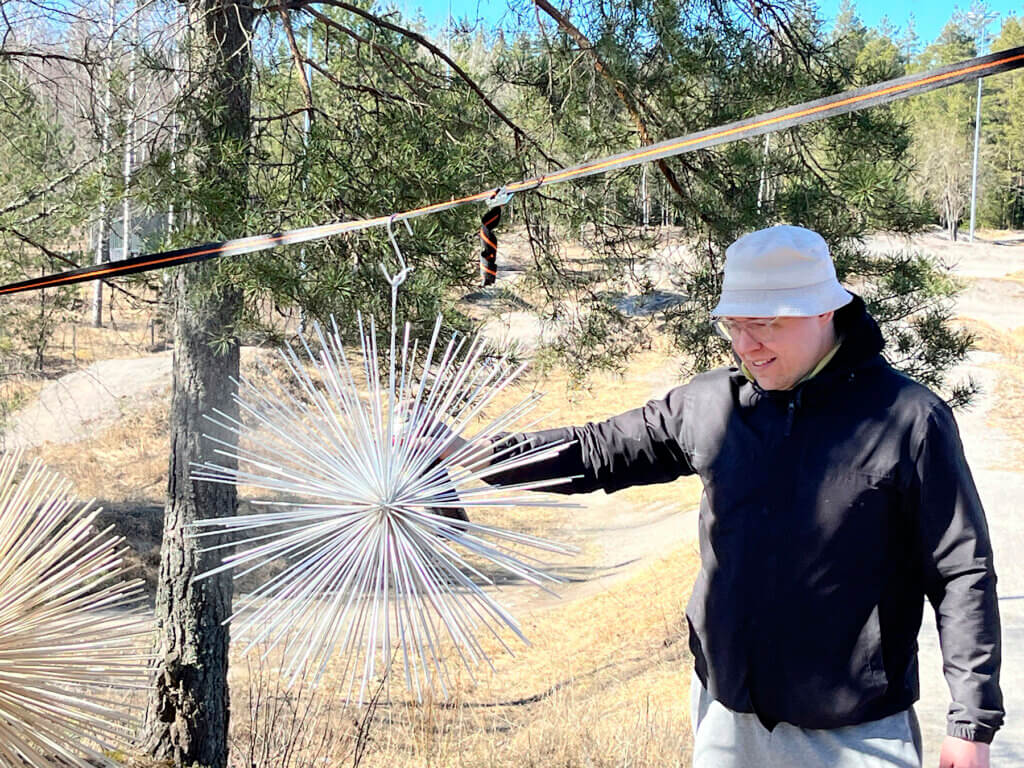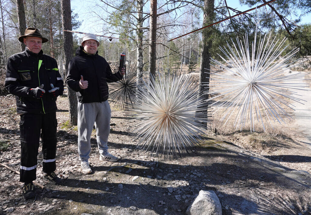 On huhtikuun puoliväli ja Lahden vanhan raviradan joutomaalla mies ripustaa piikkipalloja puiden väliin roikkumaan. Mies on Esko Airaksinen, eläkkeellä jo hyvän aikaa ollut Rakennusliiton entinen aluepäällikkö, joka odottaa paikalle taiteen monitoimimiestä, Eemeli ”Elukka” Ronkosta. Ronkonen on luvannut maalata puiset piikkipallot.