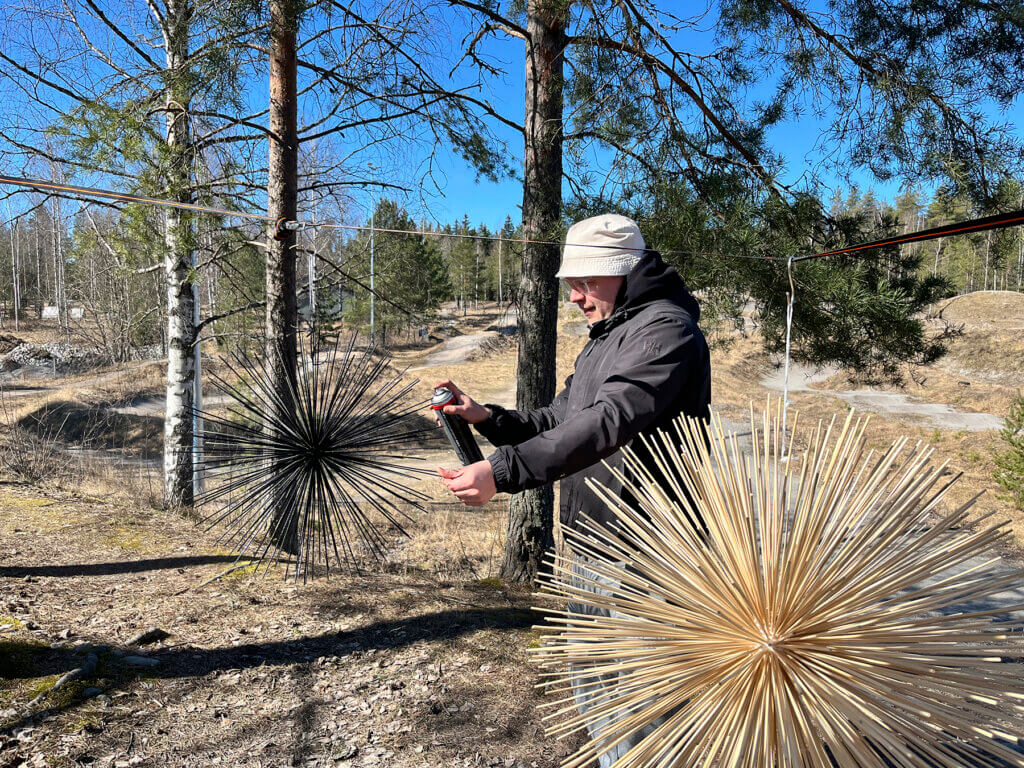 Nyt käsittelyssä on muun muassa pieneen styroksipalloon tehty työ. Kolmessa maalattavassa työssä piikkien virkaa toimittavat bambuiset grillitikut.