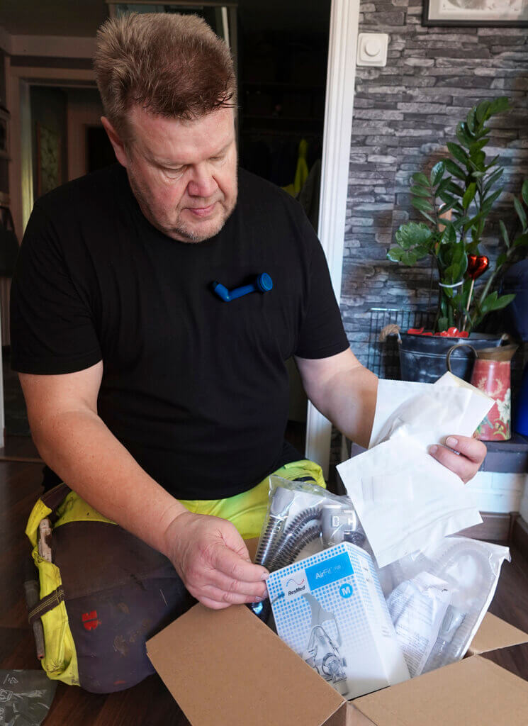 YIT Housing Oy:n alueluottamushenkilö ja Rakennusliiton hallituksen jäsen, vantaalainen Jari Jääskeläinen avaa tyytyväisenä hänelle juuri saapunutta pakettia kotinsa lattialla. Paketissa on kerran vuodessa vaihdettavat osat CPAP-laitteeseen eli ylipainehengityslaitteeseen. Ne lähetetään hänelle kerran vuodessa ilmaiseksi julkisesta terveydenhuollosta.